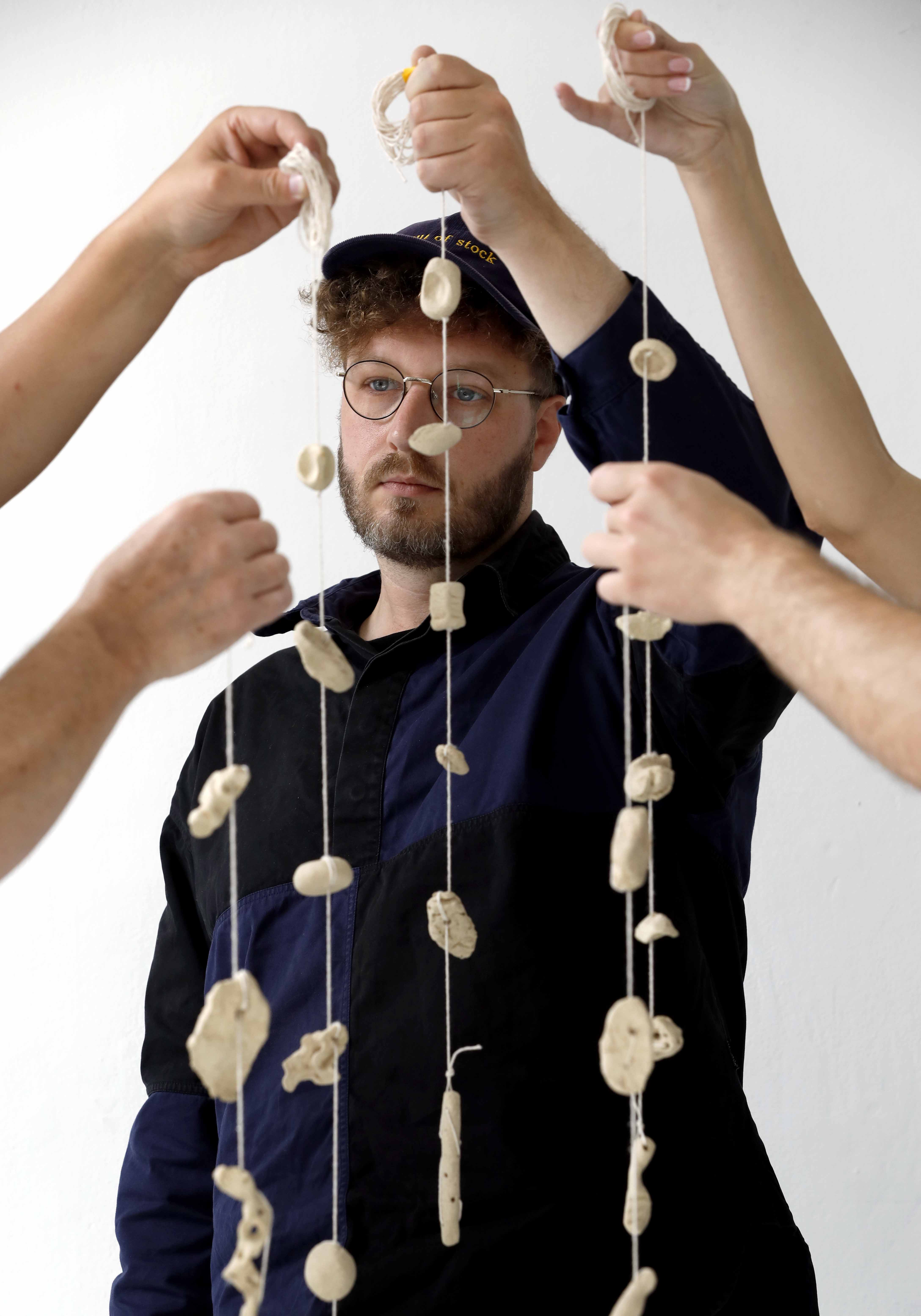 Artist Christopher Steenson pictured with a ceramic windchime, created together with residents of Galway’s Westside, which forms part of his installation ‘Where Does the Body End?’ . The windchime’s strands represent air particles and are one of the kinetic elements in the work, which takes the idea of the atmosphere as a physical body to explore how we are connected to the world through breath. PHOTO: Mark Stedman